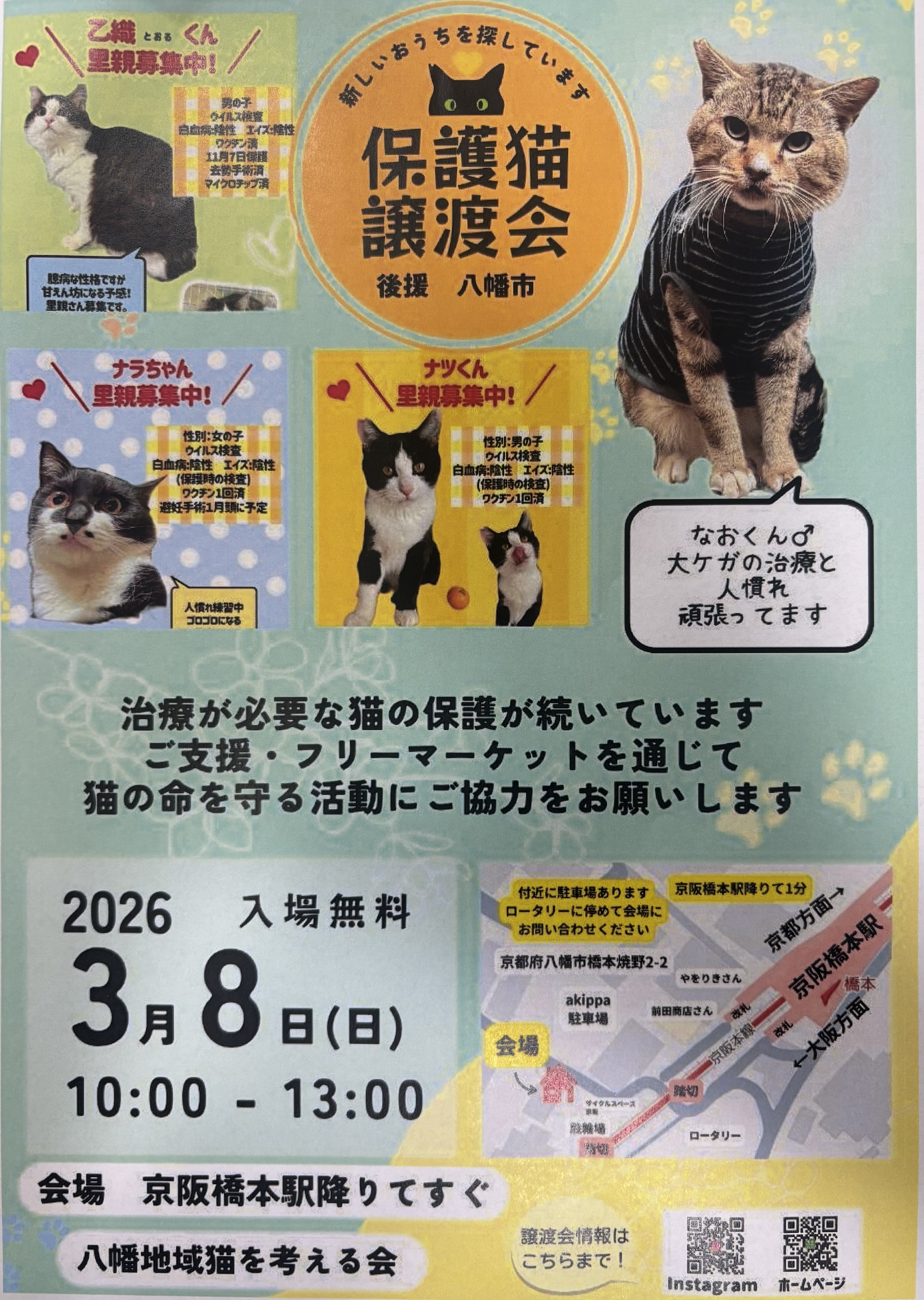 今週末、3/8(日)に「八幡地域猫を考える会」さんが、保護猫の譲渡会とフリーマーケットを開催されます。