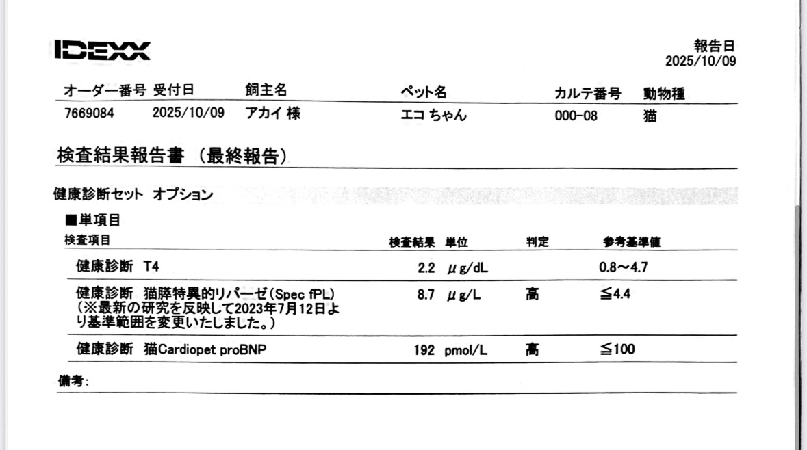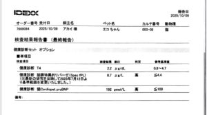 11歳半のせつ子ちゃん♀も1項目追加で、エコちゃんと同じNT-proの検査を。